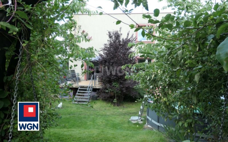 Ogród stanowi w pełni zagospodarowaną, prywatną oazę. Znajdziemy tu zarówno strefę rekreacyjną z trampoliną i basenem, jak i kącik relaksu z bujaną ławką. Miłośników natury ucieszą liczne nasadzenia, w tym owocujące krzewy borówek i malin, a także dorodne drzewa - jabłoń i czereśnia. Całość otacza starannie utrzymany, zielony trawnik. Praktycznym rozwiązaniem jest również zewnętrzne wejście prowadzące po schodach bezpośrednio do garażu, co znacznie ułatwia prace ogrodowe i przechowywanie sprzętu.